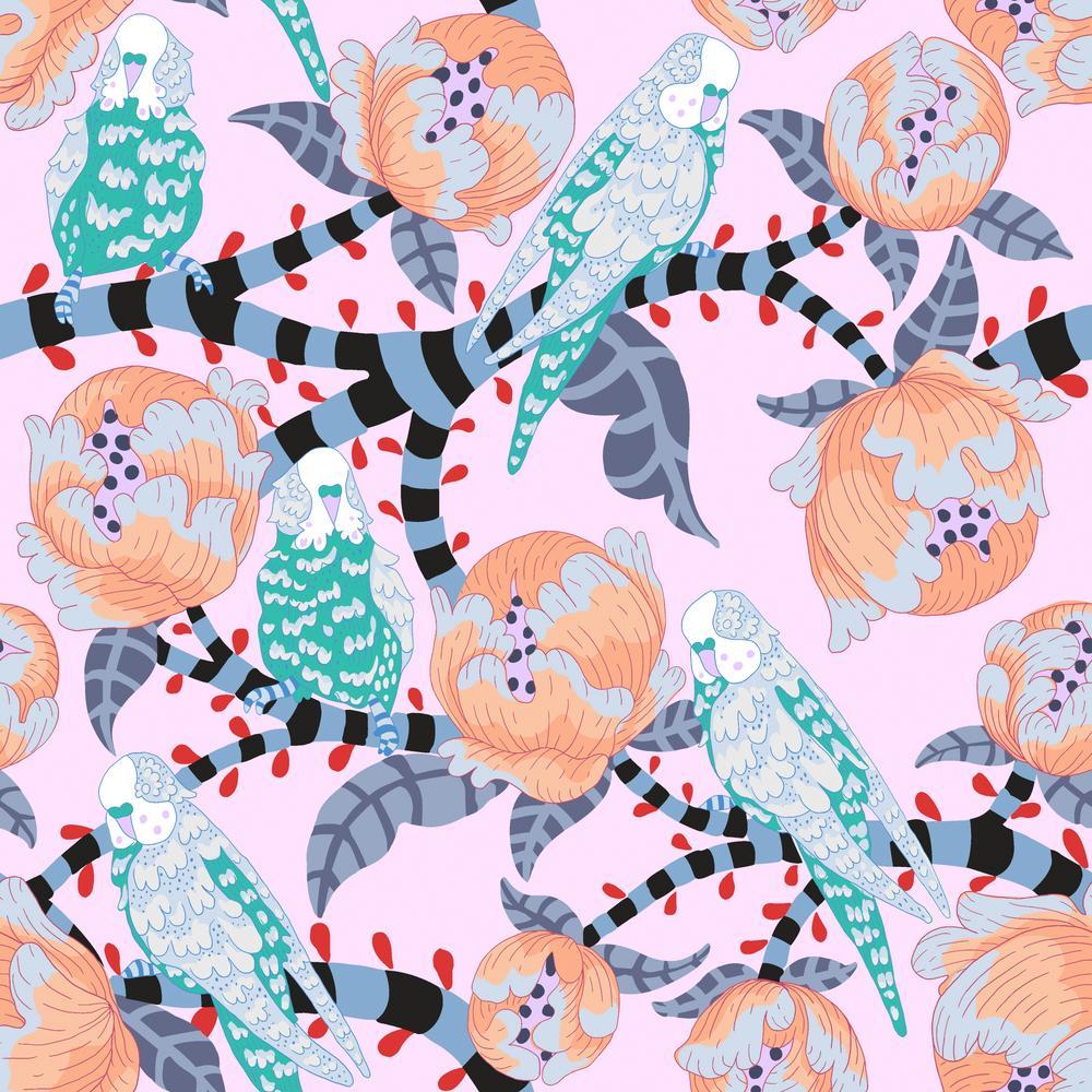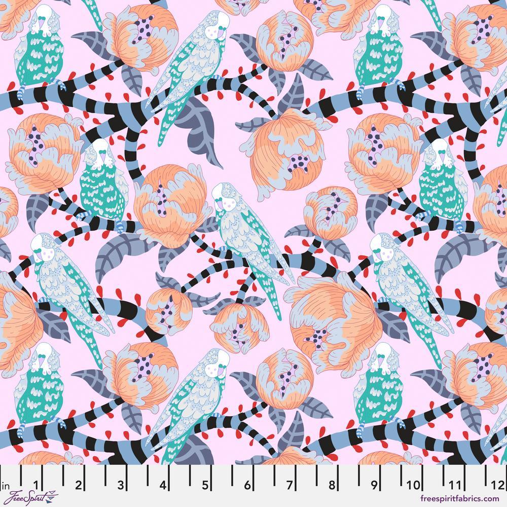 Blostma & Song is a beautiful collection by British artist Penny Jefferies. She drew inspiration from the delicate beauty of peonies and the vibrant spirit of budgies (or parakeets). The fabrics feature intricate birds and florals in a vibrant color palette featuring natural and geometric elements.