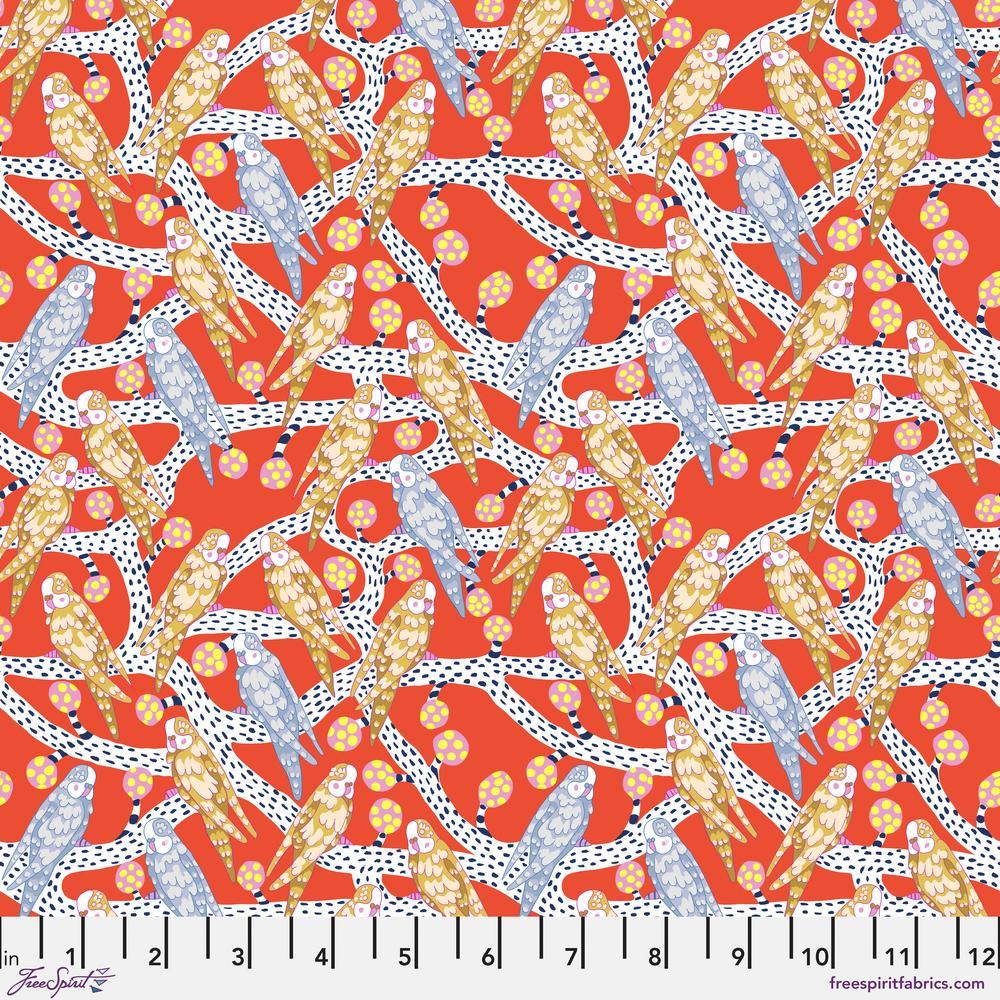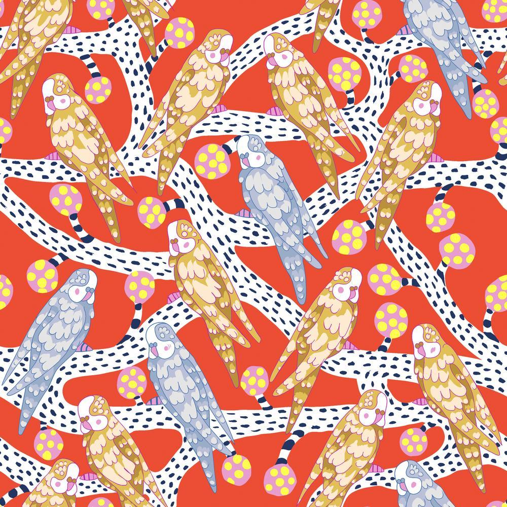 Blostma & Song is a beautiful collection by British artist Penny Jefferies. She drew inspiration from the delicate beauty of peonies and the vibrant spirit of budgies (or parakeets). The fabrics feature intricate birds and florals in a vibrant color palette featuring natural and geometric elements.