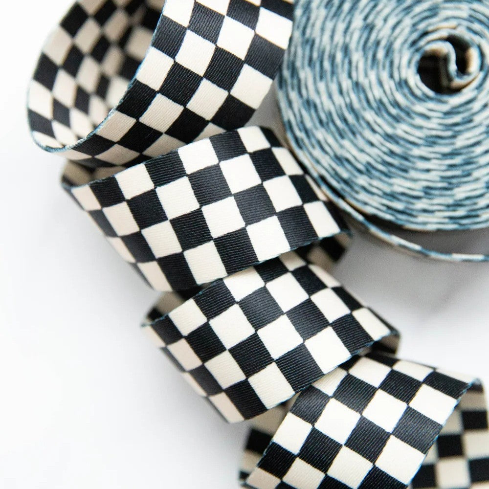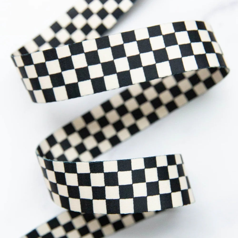 Ruby Star Society Webbing is a vibrant collection of high-quality printed belting, showcasing some of the most beloved prints from the designers’ iconic fabric lines. This one features a checker board pattern with a black and natural background . Durable yet stylish, this webbing brings a fun, creative flair to any sewing project - perfect for bag straps, handles, and eye-catching accents.